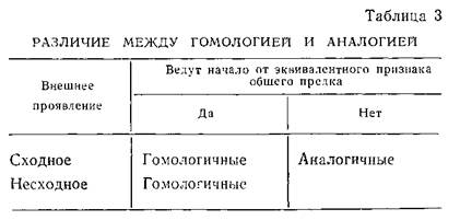 В случае гомологии сходство не входит в определение, поскольку для гомологичных структур сходство совсем не обязательно (например, слуховые косточки млекопитающих и соответствующие челюстные кости низших позвоночных). В определении же аналогии приходится упоминать о сходстве, так как негомологичные признаки, которые не сходны, не считаются аналогичными (табл. 3).