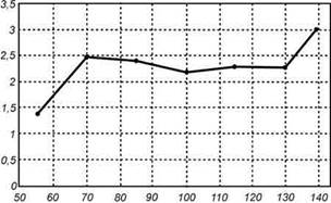 Рис.2. Соотношение между КИ и репродуктивным потенциалом среди братьев и сестер, включая холостых и незамужних. По оси Y - среднее количество детей, по оси Х - значения КИ