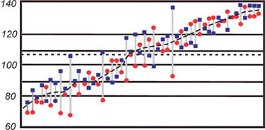 Однако результаты других исследований на эту же тему обнадеживают. Действительно, существует положительная корреляция между значениями КИ мужа и жены - то есть их умственные способности сходны, причем как при низких КИ, так и при высоких. Но вот в области средних значений КИ, похоже, эта корреляция слегка послабее - там, как говорится, возможны варианты (рис. 3).