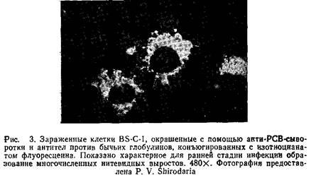 3) отсутствие флуоресценции после истощения противовирусной сыворотки зараженными клетками.