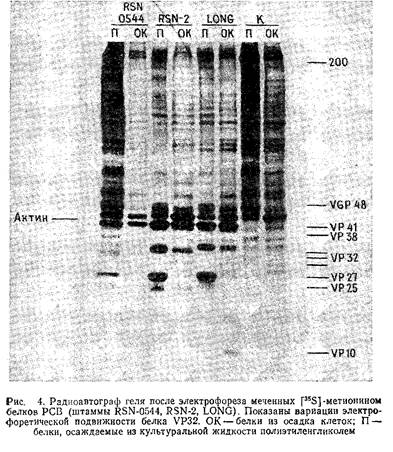 Рис.4 иллюстрирует результаты разделения меченных - метионином белков РСВ в пластине 10% -ного полиакриламидного геля. Вирусные гликопротеины можно пометить аналогичным методом, используя в качестве метки 50 мкКи/мл - глюкозамина или - маннозы. Альтернативный метод введения метки в гликопротеины оболочки РСВ заключается в йодировании поверхности зараженных вирусом клеток лактопероксидазным методом. Белки очищенного нуклеокапсида РСВ можно йодировать с помощью хлорамина Т.