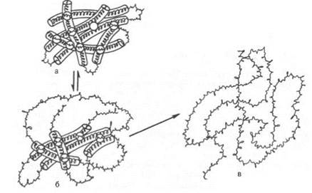 а - исходное состояние; б - начинающееся обратимое нарушение молекулярной структуры; в - необратимое развертывание полипептидной цепи.