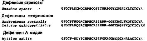 Сравнение первичной структуры дефенсинов, относящихся к классу насекомых, классу паукообразных и классу пластинчатожаберных, или двустворчатых