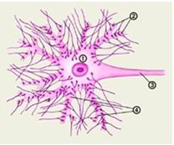 1 – тело (сома) нейрона; 2 – синаптические бляшки; 3 – аксон нейрона; 4 – дендриты.