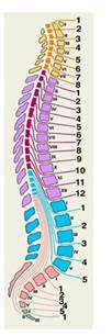 Схематическое изображение соотношений сегментов спинного мозга и позвонков на сагиттальном разрезе позвоночника. Оранжевым и желтым цветом обозначены шейные сегменты и шейные позвонки, фиолетовым и сиреневым — грудные, голубым — поясничные и копчиковые, розовым — крестцовые. Римскими цифрами обозначены позвонки, арабскими — корешки спинномозговых нервов соответствующих сегментов.