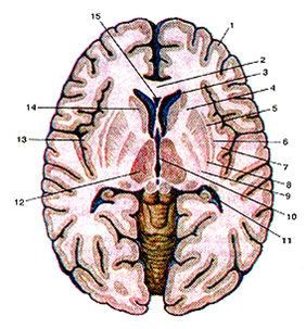 1-кора большого мозга (плащ); 2-колено мозолистого тела; 3-пе-редний рог бокового желудочка; 4-внутренняя капсула; 5-каруж-ная капсула; 6-ограда; 7-самая наружная капсула; 8-скорлупа; 9-бледный шар; 10-III желудочек; 11-задний рог бокового желудочка; 12-thalamus (зрительный бугор); 13-корковое вещество (кора) островка; 14-головка хвостатого ядра; 15-полость прозрачной перегородки.