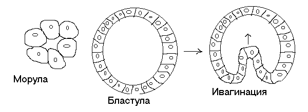 После того как клетки бластулы сформировали эпителиальный слой, наступает время для координированных движений – гаструляции. Эта радикальная перестройка ведёт к превращению полого клеточного шарика в многослойную структуру, обладающую центральной осью и двусторонней симметрией. По мере развития у животного должны определиться передний и задний концы тела, брюшная и спинная стороны и серединная плоскость симметрии, разделяющая тело на правую и левую половины. Такая полярность складывается на очень ранней стадии развития зародыша. В результате сложного процесса инвагинации (впячивания) (рис.1) значительный участок эпителия перемещается с наружной поверхности внутрь зародыша, образуя первичную кишку. Последующее развитие будет определяться взаимодействиями внутреннего, наружного и среднего слоёв, создающихся при гаструляции. После процесса гаструляции наступает процесс органогенеза – это локальное изменение определённых участков того или иного зародышевых пластов, и образование зачатка. При этом подчас невозможно выделить какой-то главенсьвующий вид клеточного материала, от которого бы зависел механизм развития органа.