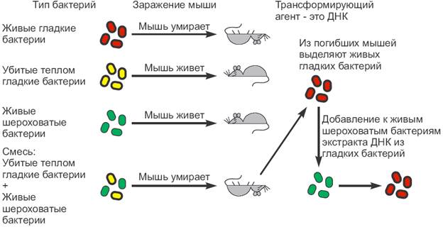 Известно, что бактерия Pneutnococcus pneumoniae имеет несколько форм. Вирулентность бактерии определяется наличием мукополисахаридной капсулы, расположенной па поверхности клетки. Эта капсула защищает бактерию от воздействий со стороны организма-хозяина. В результате, размножившиеся бактерии убивают зараженное животное. Бактерии этого штамма (S-штамм) образуют гладкие колонии. Авирулентные формы бактерий не имеют защитной капсулы и образуют шероховатые колонии (R-штамм). Микробиолог Фредерик Гриффитс в 1928 году инъецировал мышам живого пневмококка R-штамма вместе с S-штаммом, убитым высокой температурой (65°С). Спустя некоторое время ему удалось выделить из заражённых мышей живых пневмококков, обладающих капсулой. Таким образом, оказалось, что свойство убитого пневмококка - способность образовывать капсулу - перешло к живой бактерии, т.е. произошла трансформация. Поскольку признак наличия капсулы является наследственным, то следовало предположить, что какая-то часть наследственного вещества от бактерий штамма S перешла к клеткам штамма R.