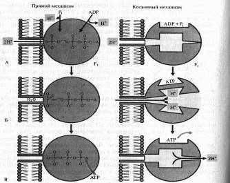 Для косвенного механизма возможны различные варианты. АДФ и неорганический фосфат присоединяются к активному центру фермента без притока, свободной энергии. Ионы Н + , перемещаясь по протонному каналу по градиенту своего электрохимического потенциала, связываются в определенных участках Fb вызывая конформационныё. изменения фермента (П. Бойер), в результате чего из АДФ, и Рi синтезируется АТФ. Выход протонов в матрикс сопровождается возвратом АТФ-синтетазного комплекса в исходное конформационное состояние и освобождением АТФ.