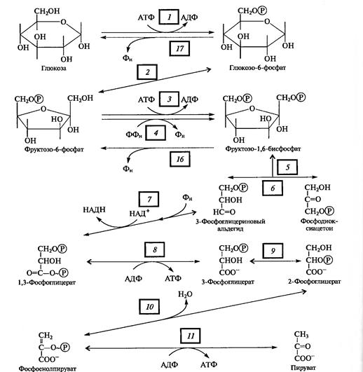 Обращение гликолиза. Возможность обращения гликолиза определяется обратимостью действия большинства ферментов, катализирующих его реакции. Однако реакции фосфорилирования глюкозы и фруктозы, а также реакция образования пировиноградной кислоты из фосфоенолпирувата, осуществляемые с помощью киназ, необратимы. На этих участках процесс обращения идет благодаря использованию обходных путей. Там, где функционируют гексокиназа и фруктокиназа, происходит дефосфорилирование — отщепление фосфатных групп фосфатазами.