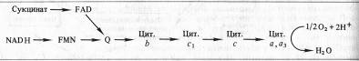 Рис. 8. Предполагаемое расположение компонентов цепи переноса электронов во внутренней мембране митохондрий в соответствии с хемиосинтетической теорией Митчелла