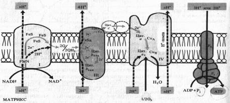 В последние годы в результате изучения пространственного расположения компонентов ЭТЦ во внутренней мембране митохондрии показано что комплексы I, III и IV пересекают мембрану. На внутренней стороне мембраны, обращенной к матриксу, два электрона и два протона от НАДH поступают на флавинмононуклеотид комплекса I.