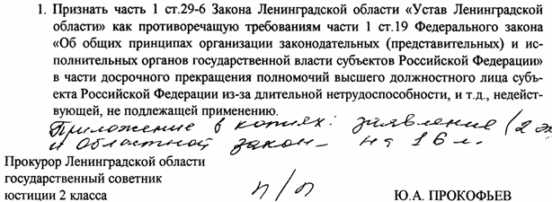 1. Согласно части 1 ст.29-6 Устава области: «В случаях невозможности исполнения Первым вице-губернатором Ленинградской области обязанностей Губернатора Ленинградской области (отставка, длительная нетрудоспособность, смерть и т.д.) Законодательное Собрание Ленинградской области по собственной инициативе утверждает временно исполняющим обязанности Губернатора Ленинградской области одного из вице-губернаторов Ленинградской области (члена Правительства Ленинградской области), вплоть до вступления в должность вновь избранного Губернатора Ленинградской области».