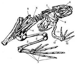 Рис 1. Скелет лягушки: 1 —кости стопы; 2 —голень; 3—бедренная кость; 4 — подвздошная кость; 5 —уростиль; 6 — крестцовый позвонок; 7 — шейный позвонок; 8 — череп; 9 — лопатка; 10—грудина; 11 — плечевая кость; 12 — предплечье; 13 — кости кисти.