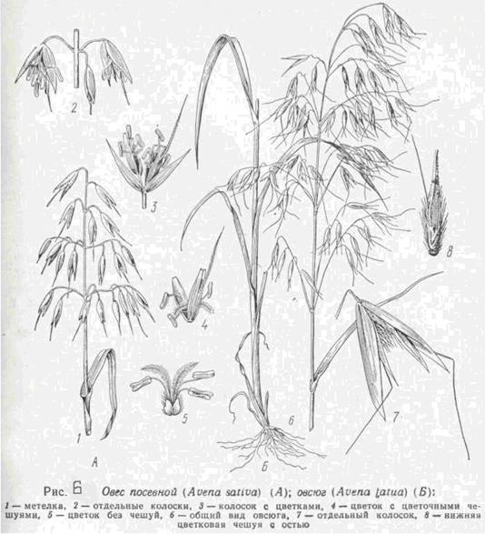 Овес (Avena) — преимущественно однолетние злаки. Листья широкие, соцветия — метелка. Колоски крупные, 2—4-цветковые (рис.6). Колосковые чешуи крупнее цветковых. Нижняя цветковая чешуя обычно с остью. В различных зонах возделывается кормовая