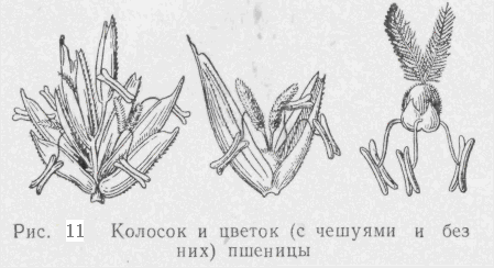 Мягкая пшеница — наиболее широко распространенный вид. Колос этой пшеницы более или менее плотный или рыхлый. Колоски 4—5-цветковые, нижние цветковые чешуи с остью или безостые (рис. 11); соломина полая Зерновка мучнистая или мучнисто-стек-ловидная. Возделываются озимые и яровые формы.