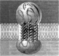 Рис.1. Структура родопсина позвоночных, встроенного в мембрану фоторецептора. Спираль несколько развернута, чтобы показать расположение ретиналя (указано черным). С - С-конец, N - N-конец.