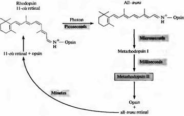 При поглощении родопсином одного фотона ретиналь претерпевает фотоизомеризацию и переходит из 11-цис в транс-конфигурацию. Этот переход происходит очень быстро: примерно за 10--12 секунд. После этого белковая часть пигмента также претерпевает серию трансформационных изменений, с образованием ряда промежуточных продуктов. Одна из конформаций протеиновой части - метародопсин II - наиболее важна для передачи сигнала (мы обсудим это далее в этой главе). На рис.2 показана последовательность событий при обесцвечивании и регенерации активного родопсина. Метародопсин II образуется уже через 1 мс. Регенерация пигмента после его распада происходит медленно, в течение нескольких минут; для этого необходимо транспортирование ретиналя из фоторецепторов в пигментный эпителий.