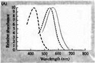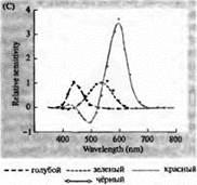Рис. 3. Спектры чувствительности фоторецепторов человека и различных зрительных пигментов. (А) Кривые спектров чувствительности трех цветовых зрительных пигментов, показывающие пики поглощения на длинах волн, соответствующих голубому, зеленому и красному. (В) Спектры чувствительности колбочек к голубому, зеленому и красному цветам, и палочек (показано черным) у макак. Ответы регистрировались при помощи всасывающих электродов, усреднялись и нормализовывались. Кривые спектра палочки были получены при исследовании зрительных пигментов на людях. (С) Сравнение спектров колбочек обезьян и человека при помощи теста чувствительности к цвету. Непрерывная кривая показывает эксперимент по определению чувствительности к цвету у человека, при предъявлении ему света разной длины волны. Пунктиром показаны результаты, предсказанные на основе регистрации токов в отдельных колбочках, после коррекции поглощения света в хрусталике и пигментами на пути к наружному сегменту. Совпадение между результатами обоих опытов удивительно высокое.