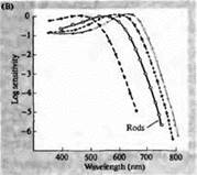 События, происходящие при поглощении света пигментом палочек - родопсином, изучались при помощи психофизиологических, биохимических и молекулярных методик. Молекула зрительного пигмента состоит из двух компонентов: белковой, называемой опсином, и хромофора, 11-цис-витамин А-альдегида, называемого ретиналем (рис.1). Следует уточнить, что хромофор содержит химическую группу, придающую цвет соединению. Количественные характеристики поглощающей способности пигментов были изучены при помощи спектрофотометрии. При освещении родопсина - зрительного пигмента палочек - светом разной длины волны, сине-зеленый свет с длиной волны около 500 нм поглощался лучше всего. Подобный результат был получен и при освещении отдельной палочки под микроскопом пучками света с разной длиной волн. Была выявлена интересная зависимость между спектром поглощения родопсина и нашим восприятием сумеречного света. Количественные психофизические исследования, выполненные на человеке, показали, что голубовато-зеленый дневной свет с длиной волны около 500 нм оптимален для восприятия сумеречного света в темноте. Днем, когда палочки неактивны и используются только колбочки, мы наиболее чувствительны к красному цвету, соответствующему спектру поглощения колбочек (об этом мы поговорим далее).