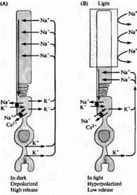 Входящий ток в темноте переносится в основном ионами натрия, следующими по электрохимическому градиенту через катионные каналы наружного сегмента. Гиперполяризация фоторецептора при действии света обусловлена закрытием этих каналов, что приводит к сдвигу мембранного потенциала в сторону ЕК.