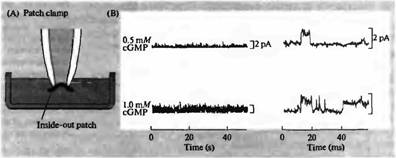 Фесенко, Яу, Бейлор, Страйер с коллегами показали, что циклическая ГМФ играет роль внутреннего переносчика сигнала от диска к поверхности мембраны. Как показано на рис.4, высокая концентрация цГМФ в цитоплазме поддерживает катионные каналы в открытом состоянии. При уменьшении концентрации цГМФ с внутренней поверхности мембраны открытие катионных каналов становится редким событием. Таким образом, мембранный потенциал фоторецепторов является отражением концентрации цГМФ в цитоплазме: чем выше концентрация цГМФ, тем больше деполяризация клетки. Концентрация же цГМФ, в свою очередь, зависит от интенсивности падающего света. Повышение интенсивности света приводит к уменьшению концентрации цГМФ и уменьшает долю открытых каналов. В отсутствии цГМФ почти все каналы закрыты, и сопротивление мембраны наружного сегмента приближается к значению сопротивления липидного бислоя.