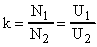 Для преобразования переменного тока одного напряжения в переменный ток другого напряжения при той же частоте используют устройство, называемое трансформатором. Трансформатор представляет собой систему, состоящую из двух обмоток (катушек), связанных одним сердечником. Если первоначально катушка содержит N1 витков, а вторичная - N2 витков, то коэффициент трансформации k вычисляется по формуле: