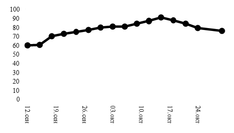 Рисунок 1. Влажность плодов калины обыкновенной в период созревания