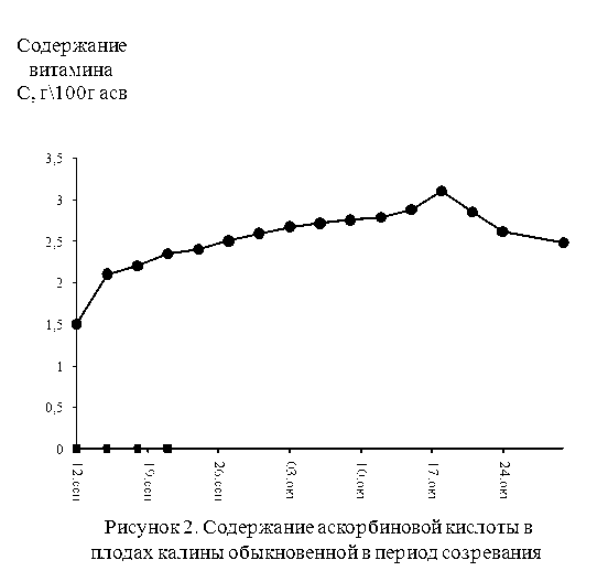 Анализ результатов показал, что содержание витамина С меняется в период созревания и зависит от срока созревания плодов калины обыкновенной. В период с 12 сентября по 12 октября содержание аскорбиновой кислоты изменяется с 1,44г по 2,78г на 100 г а.с.в. В период с 12 по 19 октября отмечена наибольшая интенсивность накопления витамина С, что составляет 3,1г кислоты на 100г сухого вещества. В период с 19 по 31 октября содержание падает до 2,37г на 100г сухого вещества.