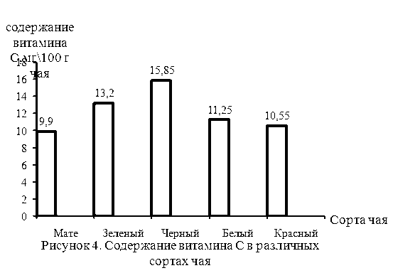 Из полученных результатов видно, что содержание витамина С зависит от сорта чая. Определено, что в наибольшем количестве аскорбиновая кислота содержится в черном чае. В чае мате и в красном чае содержание витамина С наименьшее по сравнению с другими сортами чая.