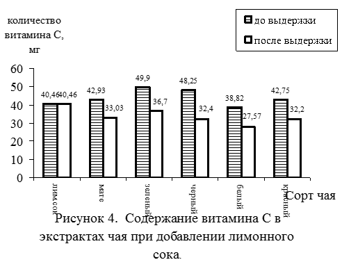 В экстракт чая каждого из сортов добавить 2 мл сока лимона, определить содержание витамина С. Через 1 час находят содержание аскорбиновой кислоты в каждом из сортов. Сравнивают содержание витамина С до и после выдерживаемого времени [33].