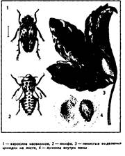 Мелкая цикадка длиной до 10 мм. Повреждает землянику и другие травянистые растения (чаще в затененных влажных местах). Распространена повсеместно. Получила видовое название из-за того, что личинки живут в выделенной ими пенистой слюноподобной жидкости, которая предохраняет их от подсыхания и других неблагоприятных факторов.