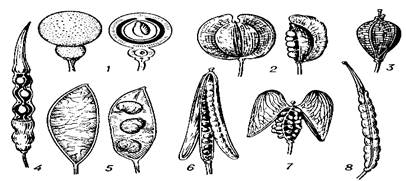 Плоды крестоцветных: 1 — катрана морского (Crambe maritima); 2 — ярутки полевой (Thlaspi arvense); 3 — рыжика посевного (Camelina sativa); 4 — редьки дикой (Raphanus raphanistrum); 5 — лунника многолетнего (Lunaria rediviva); 6 — желтофиоля садового (Cheiranthus cheiri); 7 — пастушьей сумки (Capsella bursapastoris); 8 — брюквы (Brassica napus).