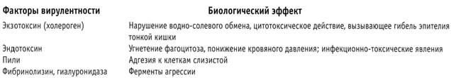 V.cholerae образует эндотоксин. Кроме того, он выделяет экзотоксин, состоящий из нескольких фракций, наиболее важной из которых является холероген. Холероген вызывает гиперсекрецию воды и хлоридов в просвет кишечника, нарушение обратного всасывания натрия, в результате возникает диарея, приводящая к обезвоживанию организма. Экзотоксин обладает также цитотоксическим действием и вызывает гибель клеток эпителия тонкой кишки. У возбудителя холеры имеются ферменты агрессии – фибринолизин, гиалуронидаза, лецитиназа, нейраминидаза. Патогенность связана также с адгезивными свойствами (белки наружной мембраны), подвижностью вибриона. [6]