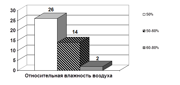Относительная влажность воздуха в помещениях обычно составляет 50%. Растения, способные существовать в такой влажности воздуха относятся к неприхотливым и составляют большинство от всех растений, представленных на цветочном рынке города Самары (см. рис. 3.3.1.).