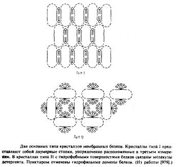 Наиболее детальную структурную информацию об очищенных мембранных белках можно получить, исследуя методом рентгеновской дифракции трехмерные белковые кристаллы. К сожалению, оказалось, что интегральные мембранные белки очень трудно кристаллизовать. Будучи удалены из своего естественного липидного окружения, неполярные участки липидных молекул склонны агрегировать с образованием неупорядоченных форм, непригодных для кристаллографического анализа. Ясно, что необходимы специальные методы, позволяющие обойти эти трудности, и в этом был достигнут определенный прогресс. Михель обратил внимание, что мембранные белки образуют кристаллы двух типов. Кристаллы типа I напоминают стопки мембран. В них осуществляется латеральное взаимодействие между неполярными участками, а мембраноподобные слои связывают полярные участки белков. Подобные кристаллы были получены для нескольких белков, но ни в одном случае их нельзя было исследовать с помощью дифракции с высоким разрешением. Кристаллы типа II стабилизируются за счет контактирования полярных участков белковых молекул, а небольшие амфифильные соединения или детергенты в основном заполняют промежутки между ними. Заметим, что очень важными являются размер, заряд и другие свойства детергентов; если эти параметры неблагоприятны, то детергент может дестабилизировать кристаллическую структуру.