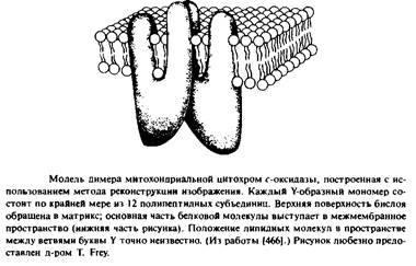 Например, отдельные части цитохром с-оксидазы возвышаются над поверхностью бислоя на 50 А 1314, 466] ; такая же картина наблюдается для ацетилхолинового рецептора. Напротив, порин и бактериородопсин почти не выдаются над поверхностью мембран. На рис.3.3 представлена структура цитохром с-оксидазы, полученная с низким разрешением.