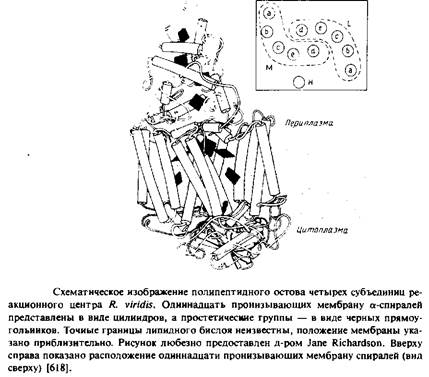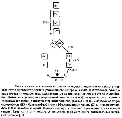 Фотосинтетические реакционные центры представляют собой комплексы белков с пигментами; в них происходит первичное разделение зарядов в фотосинтетических мембранах. Лучше всего охарактеризованы комплексы из пурпурных несерных бактерий; они обычно состоят из трех белковых субъединиц - Н, М и L. Реакционный центр Rhodopseudomonas viridis имеет также четвертую субъединицу - цитохром с-типа. Простетическими группами этого комплекса являются четыре гемогруппы, четыре бактериохлорофилла Ь, два бактериофеофитина, одно негемовое железо, один менахинон и один убихинон. Под действием света электрон переходит от первичного донора электронов, так называемой "специальной пары" - молекул бактериохлорофилла, образующих димер, к бактериофеофитину, а затем к первичному хиноновому акцептору QA. В конце концов электрон восстанавливает вторичный акцептор Qb в ходе реакции, при которой протоны поступают из раствора на восстановленный хинон. Qb находится в равновесии с хинонным пулом в би-слое. Окисленный первичный донор электронов, "специальная пара", восстанавливается цитохромом с-типа. Поскольку цитохром и хинон расположены на противоположных сторонах фотосинтетической мембраны, светозависимый электронный транспорт электроге-нен и генерирует трансмембранную разность потенциалов.