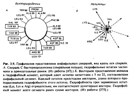 Эти а-спирали обычно обозначаются буквами А, В, С, D, E, F, G, начиная с N-конца. Каково соответствие между ними и семью спиралями, выявленными с помощью электронно-микроскопических исследований, - неизвестно. Этот вопрос неоднократно обсуждался, и здесь существуют разные мнения. Почти не вызывает сомнений, что общая топология, представленная на рис.3.8, адекватна. Разные модели, описанные в литературе, в каких-то отношениях могут существенно различаться. Это касается, в частности, длины нескольких спиралей, расположенных внутри бислоя, которая варьирует в разных моделях в пределах 10 остатков. Несмотря на эти разногласия, по главным особенностям достигнут консенсус, хотя говорить о единодушии нельзя. Эти особенности следующие.