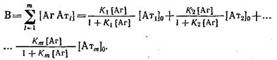 В предположении об отсутствии внутри- и межмолекулярных взаимодействий Муккур с сотрудниками ввели понятие об общей константе аффинности Ки представляющей собой сумму произведений равновесных констант каждой из m субпопуляций антител на множители, учитывающие концентрационный вклад каждой из фракций в общей популяции антител: