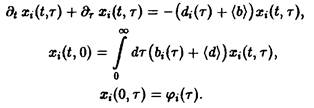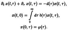 Уравнения, с начальными условиями, задают модель Маккендрика–фон Фёрстера для популяций с возрастной структурой. Эта модель позволяет определить временную эволюцию функции плотности x по заданному начальному распределению у, если известны скорость воспроизведения и смертность. Решения, получаемые в рамках этой модели при различных конкретных функциях D и В, подробно изучены (McKendrick, 1926; von Foerster, 1959; Полу-эктов, 1974; Полуэктов и др., 1980; Романовский и др., 1984). Смертность D и рождаемость В, вообще говоря, сложным образом зависят от плотности x и), что приводит к существованию разнообразных структур решений. Однако уравнения в этом случае также становятся весьма сложными, и их аналитическое решение становится невозможным. Поэтому мы сначала рассмотрим простейший случай, когда рождаемость и смертность линейны по плотности x и не зависят явно от времени: