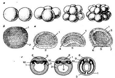 Рис. 1. Начальные стадии развития ланцетника: а – дробление (стадия двух, четырех, восьми, шестнадцати бластомеров); б – бластула; в - гастру. чяция; г – схематический поперечный разрез через зародыш ланцетника; 2 – вегетативный полюс бластулы; 3 – энтодерма; 4 – бластогель; 5 – рот гаструлы (бластопор); 6,7 – спинная и брюшная губы бластопора; 8 – образование нервной трубки; 9 – образование хорды; 10 – образование мезодермы