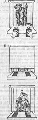 А — демонстрация приманки и пустого контейнера; Б — приманку и пустой контейнер закрывают от животного непрозрачным экраном; В — экран убирают, и животное имеет возможность достать приманку, положение которой не изменилось. При следующем предъявлении этого теста контейнер с приманкой может располагаться слева.
