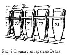 Аппарат Вейса устанавливают в стойке, имеющей два гнезда, одно из которых удерживает нижнюю часть, а другое - среднюю часть сосуда, причем аппарат обязательно должен стоять в строго вертикальном положении. В противном случае струи воды будут направляться по одной стороне сосуда, что может вызвать неравномерное вращение икринок и заморы в отдельных частях аппарата.