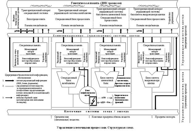 Отсюда, как следствие, вытекает и тот факт, что все клеточные процессы управляются, регулируются и взаимно координируются той программной информацией, которая (с помощью генетической информации и элементной базы) загружена в аппаратную систему клетки, то есть находится в функциональных биомолекулах и структурах клетки! Каждая из управляющих систем клетки (операционная система, управляющие системы катаболизма, биосинтеза элементной базы, биосинтеза макромолекул клетки и т. д.), состоящая из генетической памяти, комплекса локальных биопроцессорных устройств и выходного управляющего звена – молекулярных биологических автоматов и манипуляторов, воспринимает информацию о ходе химических превращений, об эффективности протекающих процессов, об изменении внешних и внутренних физических и химических факторов и, в зависимости от результата, корректирует управляющие воздействия.
