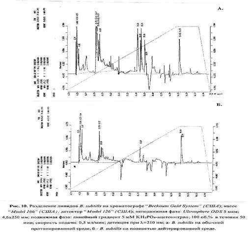 Структурно-динамические свойства клеточной мембраны, которые в большинстве зависят от качественного и количественного состава липидов, также могут изменяться в присутствии 2H2O. Так, сравнительный анализ липидного состава дейтерированных клеток B. subtilis, полученных при росте на 2H2O показал различия в количественном составе мембранных липидов по сравнению с Н2О (рис. 4). Примечательно, что в дейтерированном образце соединения, имеющие времена удерживания - 33.38; 33.74 и 33.2 мин не детектируются (рис. 4 б). Полученный результат, по видимому, объясняется тем, что клеточная мембрана является одной из первых органелл клетки, которая испытывает воздействие 2H2O, и тем самым компенсирует реалогические параметры мембраны (вязкость, текучесть, структурированность) изменением количественного состава липидов.