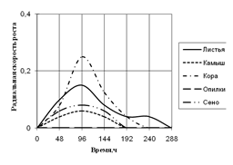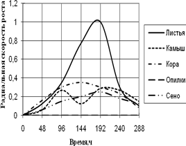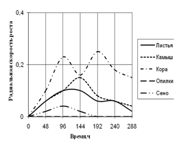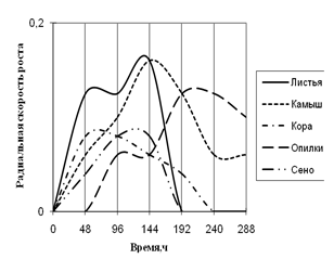Радиальная скорость роста A. flavus на протяжении всей экспозиции значительно не изменялась. Максимальная скорость роста на среде с сеном приходится на 96 ч., на средах с листьями, камышом и корой – на 192 ч. времени культивирования. Также как и A. fumigatus, A. flavus не использует опилки в качестве единственного источника углерода. На средах с листьями и сеном вид растет с 2-суточной периодичностью. Биоритмы большей продолжительности (3,5–4-х суток) наблюдаются на средах с камышом и корой.