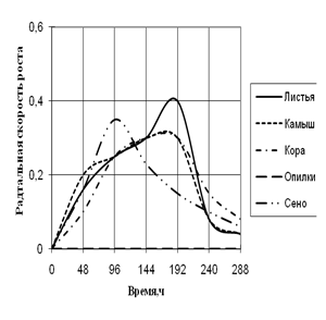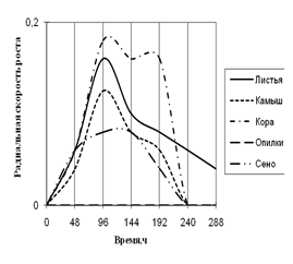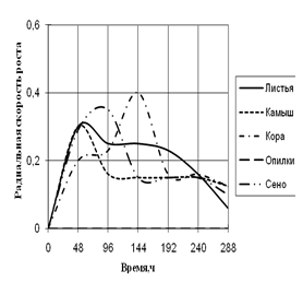 На основании полученных данных составляли графики зависимости радиальной скорости роста исследуемых штаммов от времени, определяли способность исследуемых штаммов использовать в качестве единственного источника углерода природные растительные материалы (камыш, сено, растительный опад, опилки, кора).