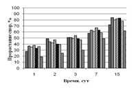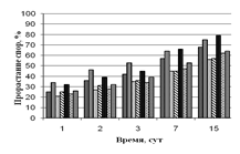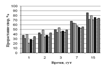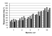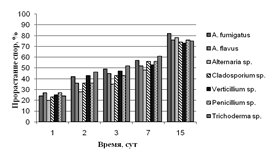Из рисунка 4 видно, что на всех субстратах с увеличением времени экспозиции заметно возрастает процент прорастания спор. На гидролизате листьев все грибы растут примерно с одинаковой скоростью, к 15-м суткам достигая 80 % прорастания от общего количества спор.