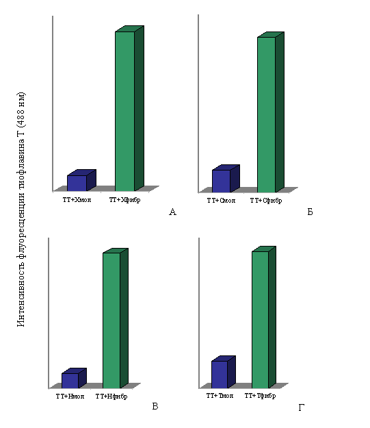 Рис. 17. Интенсивность флуоресценции тиофлавина Т (TT): А – в присутствии молекулярного X-белка (в растворе, содержащем 0.3 M KCl, 10 мМ К-фосфат, рН 7.0) и в присутствии фибрилл X-белка (0.15 М глицин-KOH, рН 7.5); Б – в присутствии молекулярного С-белка (0.3 M KCl, 10 мМ К-фосфат, рН 7.0) и в присутствии фибрилл С-белка (0.15 М глицин-KOH, рН 7.5); В – в присутствии молекулярного Н-белка (0.3 M KCl, 10 мМ К-фосфат, рН 7.0) и в присутствии фибрилл Н-белка (0.15 М глицин-KOH, рН 7.5); Г – в присутствии молекулярного тайтина (0.6 М KCl, 30 мМ KH2PO4, рН 7,0) и в присутствии фибрилл тайтина (0.15 М глицин-KOH, рН 7.5). Молярное соотношение красителя и белка 1:2.